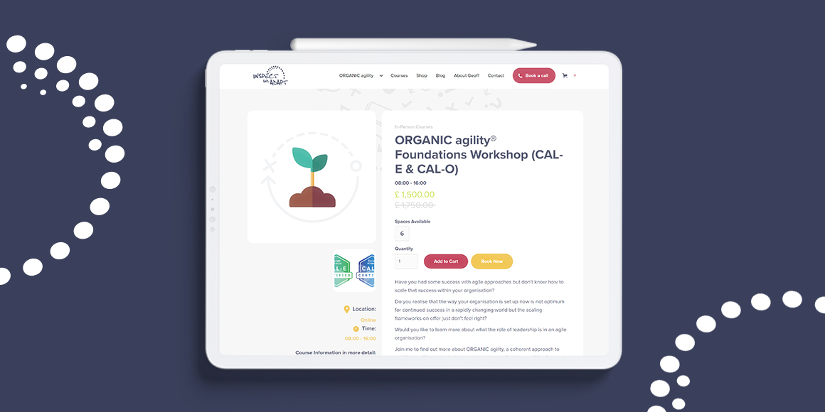Geoff required a site that showcased his resources but helped guide users to relevant information on the site. The site also needed to handle varying course types, bookings and function as a repository for various resources related to Agile, Coaching, and Training.